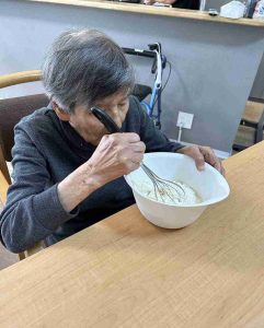 日頃は職員と一緒におやつ作りを手伝ってくれています。毎回真剣に材料を混ぜて頂き、